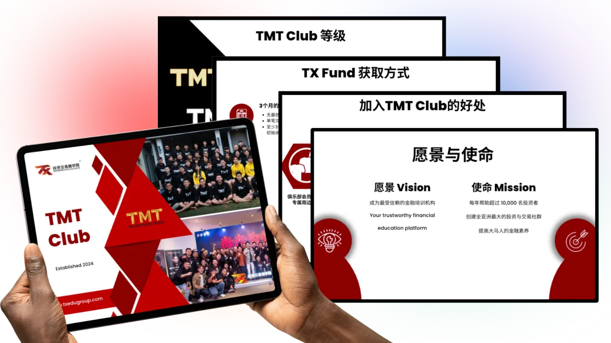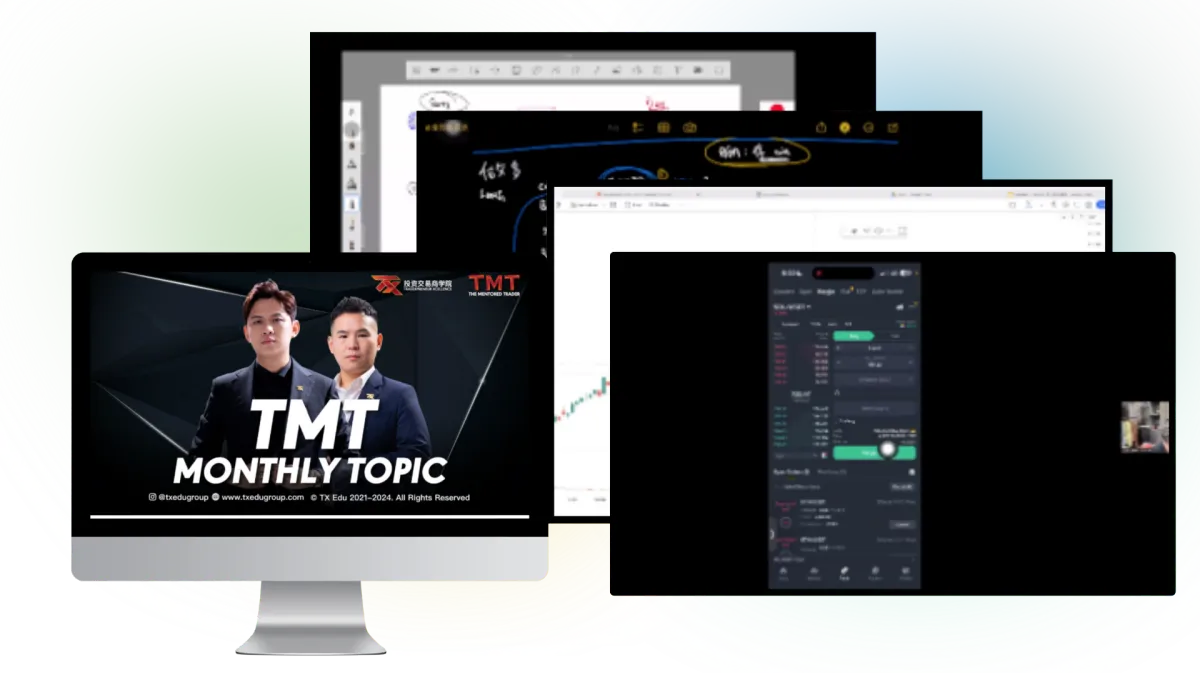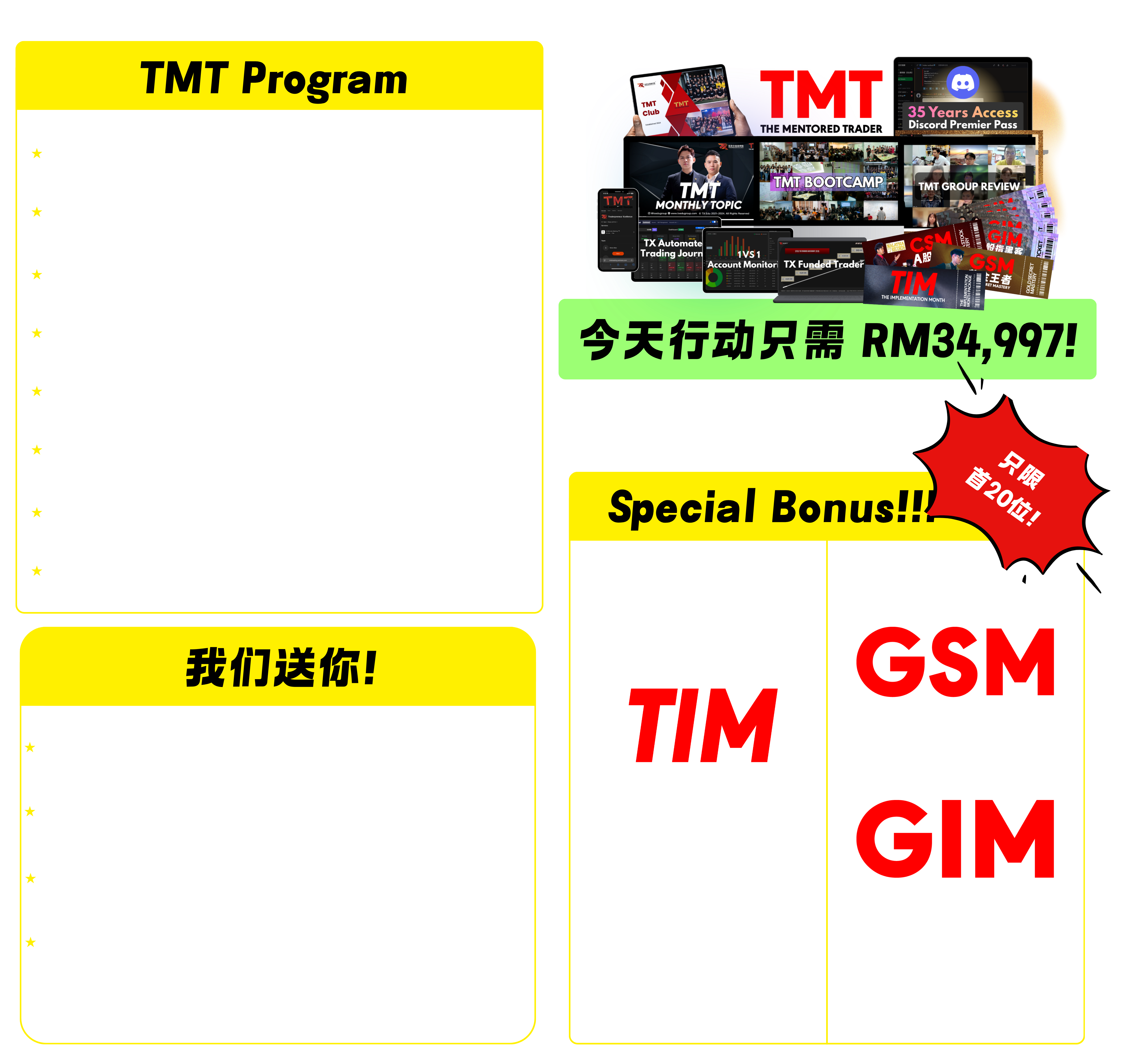 TMT - THE MENTORED TRADER 核心目的是帮助你从掌握交易基础,到系统化进阶、放大资金、成为稳定盈利交易员,通过1年的陪跑与教练指导,实现“以实力换资金”的目标。当然TMT PROGRAM 我们也会提倡BEYOND TRADING 帮助你不止在交易上面取得成功。而是整体的财务规划,整体的提高你的财商。